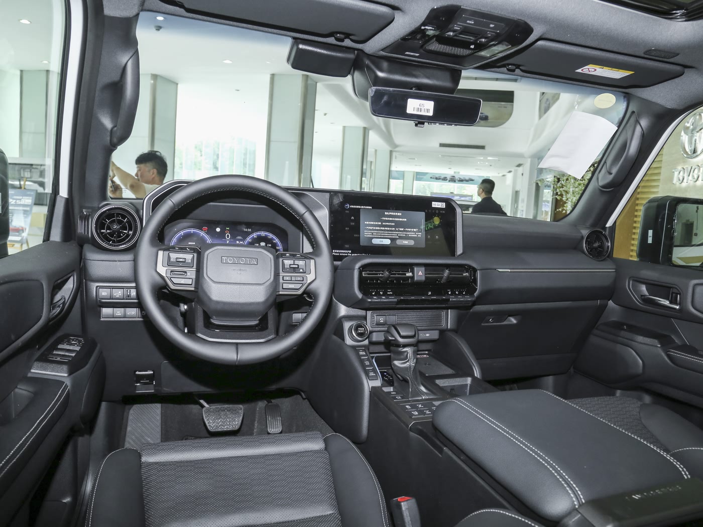 我们首先新车的外观设计方面,前脸采用穿越BX版外方内圆大灯组与全能TX版方形矩阵灯组双设计语言,五竖条进气格栅升级为镀铬包裹,配合TOYOTA字母标识形成视觉焦点。LED大灯组集成自适应远近光功能,30度接近角配合粗壮前保险杠,在保留经典硬朗气质的同时,新增科技感灯语系统。旗舰VX版专属的熏黑中网与金属护板,将越野防护性能提升至新高度。