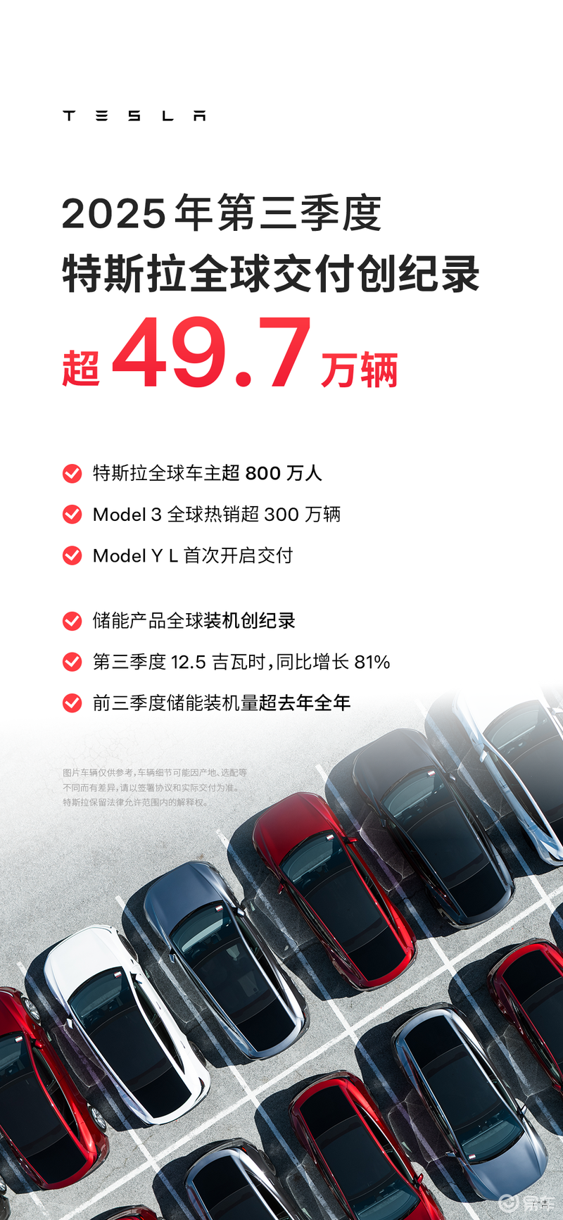 易车讯日前,特斯拉发布2025年第三季度全球生产与交付报告,电动车和储能业务双双创出新高。第三季度特斯拉全球共生产纯电动车约44.7万辆,交付量达49.7万辆。同期,特斯拉储能产品装机量达到12.5吉瓦时,上海储能超级工厂产能释放持续助推业务增长。上海超级工厂9月交付量超过9万辆,中国市场销量超7.1万辆,环比增长25%。