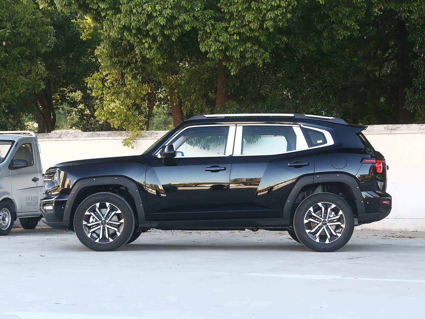 再来看车身侧面部分,车身侧面延续了哈弗大狗PLUS硬派与时尚交融的设计哲学,通过立体化的型面处理与功能细节的巧妙结合,塑造出蓄势待发的动感姿态。4705mm的车长与2810mm轴距形成修长比例,车顶线条从B柱开始微微下倾,配合200mm的最小离地间隙,既保持了方盒子造型的越野特征,又优化了城市通勤的实用性。外扩的梯形轮眉采用铆钉装饰,搭配20英寸黄金甲轮毂(可选装AT轮胎),在视觉上强化了力量感,车窗下沿的镀铬饰条延伸至D柱形成锐角转折,与贯穿式腰线共同构成富有张力的光影曲面,这种摒弃传统平直设计的手法,使车身在阳光下呈现出如铠甲般的立体层次。