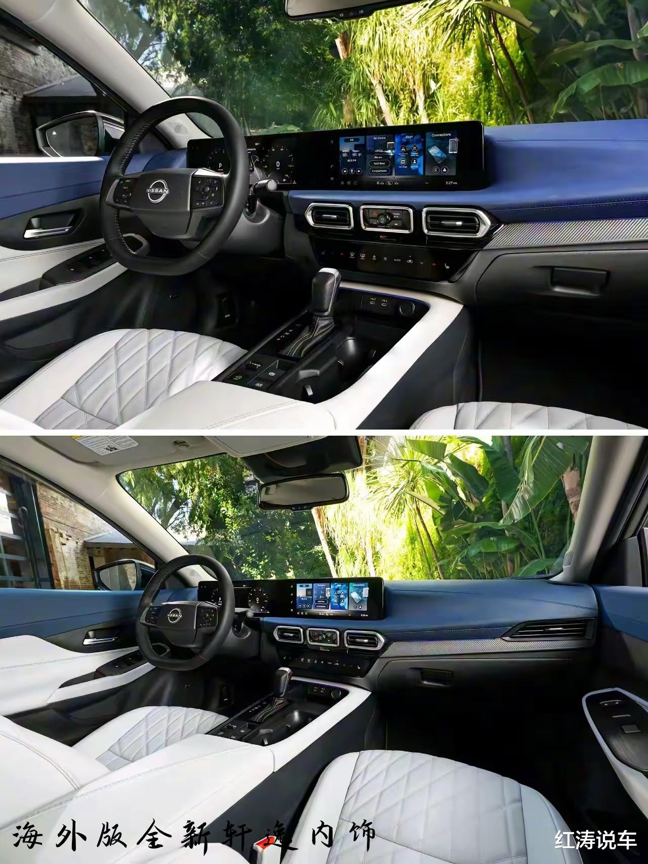 全新一代轩逸(国产版)的内饰还未曝光,预计会同步更新成海外版全新轩逸的设计,中控台偏向驾驶者一侧,三个空调出风口应用镀铬材质点缀,配备双辐式多功能方向盘,液晶仪表和中控屏组成的双连屏营造出科技氛围,车机系统相比现款轩逸将会有明显的提升,功能更齐全,操作也会更流畅,副仪表台拥有挡杆、电子手刹、杯托等,前排扶手箱的上面做了斜向缝线处理。
