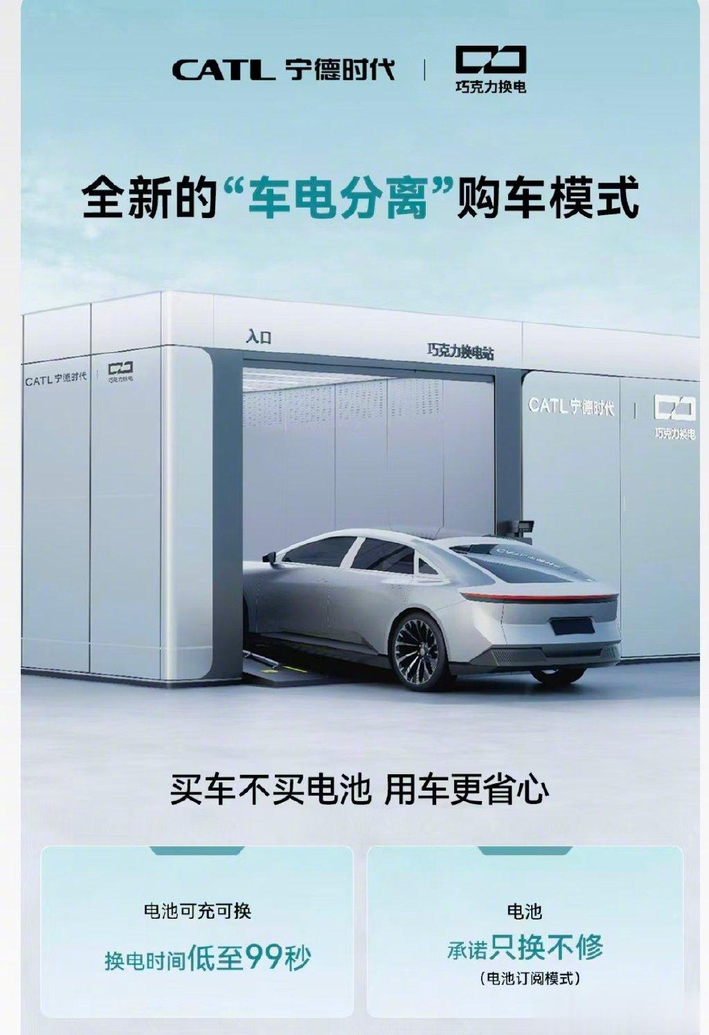 京东APP显示,该款车型采用宁德时代巧克力换电模式,电池可充可换,换电时间低至99秒,电池承诺只换不修。