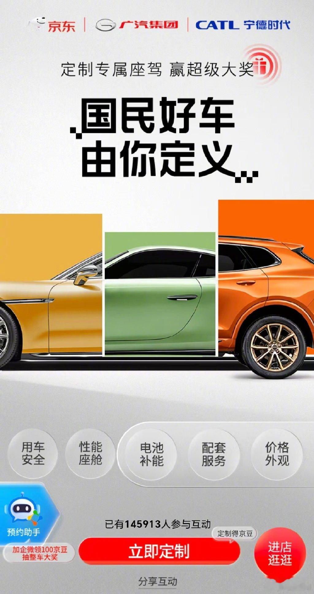 此次新车发布前,京东还推出了互动环节。在京东APP搜索“国民好车”直达“京东国民由你定义”定制H5活动页参与互动,完成调研任务即可获得10京豆奖励,推荐好友参与,新增1位可再送50京豆,至高累计10人。加入专属企微,还可再获得100京豆,并有机会抽取汽车等。