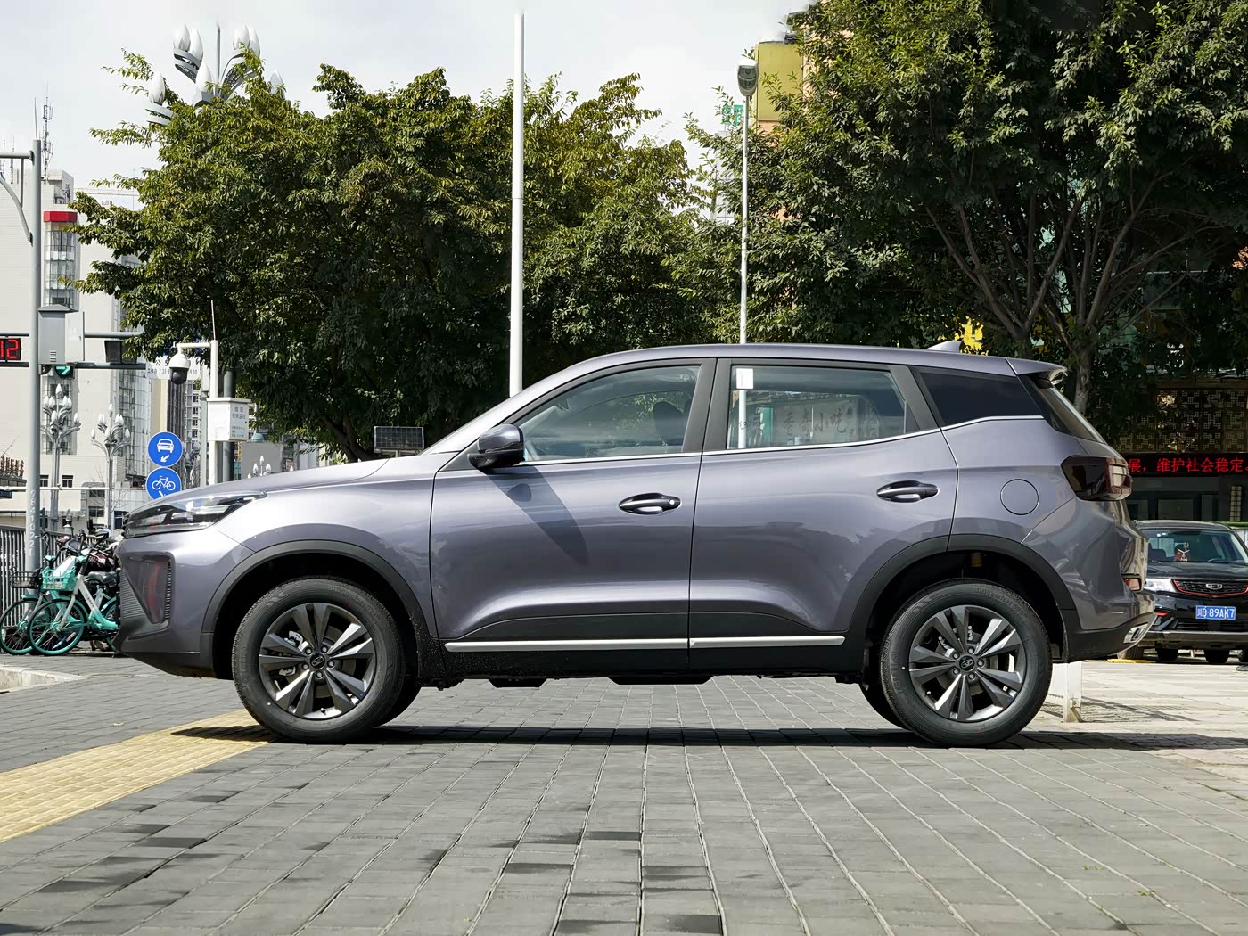 再来看车身侧面部分,新车侧面造型堪称 “动感教科书”,前长后短的俯冲式腰线从中门位置断开,配合熏黑处理的 B/C/D 柱,营造出悬浮式车顶的视觉效果,让车身显得更加修长轻盈。部分车型配备的18 英寸旋风轮圈搭配红色刹车卡钳,进一步强化了运动属性,而侧裙与车窗下沿的银色镀铬饰条,则在细节处彰显精致感。炫界 Pro 的车身设计在 “小尺寸大空间” 的理念下做到了极致,4400×1831×1653mm 的长宽高与 2632mm 的轴距,在同竞品车型中处于上游水平,尤其是 1831mm 的车宽,为车内横向空间奠定了良好基础。