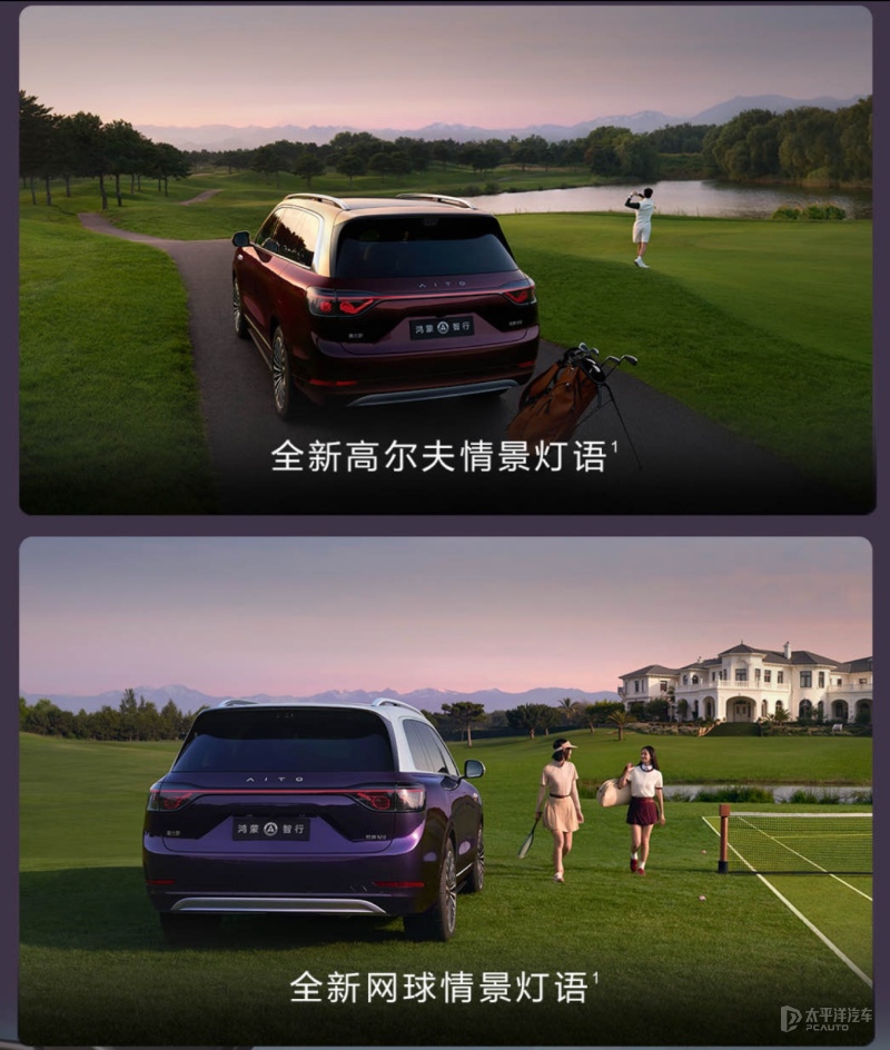 外观方面,问界M9尊四座延续现款车型,没有太多变化,主要新增银境紫外观配色,加上现有的牧野青、鎏金黑、雅丹黑、星河蓝、金瑞红共6款颜色可选。同时,新车前大灯组新增全新迎宾灯语——双龙出海,后尾灯组新增全新高尔夫情景灯语和网球情景灯语。