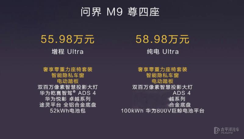 作为了解,问界M9(查成交价|车型详解)尊四座共推出2款车型,售价区间为55.98-58.98万元。作为新增车型,新车基于问界M9Ultra版5座升级而来,标配零重力座椅套装、智能隐私玻璃和电动踏板,同时新增银境紫外观配色和全新灯语,动力上提供增程和纯电动力可选,增程版CLTC纯电续航最高290km,纯电版CLTC续航最高630km。