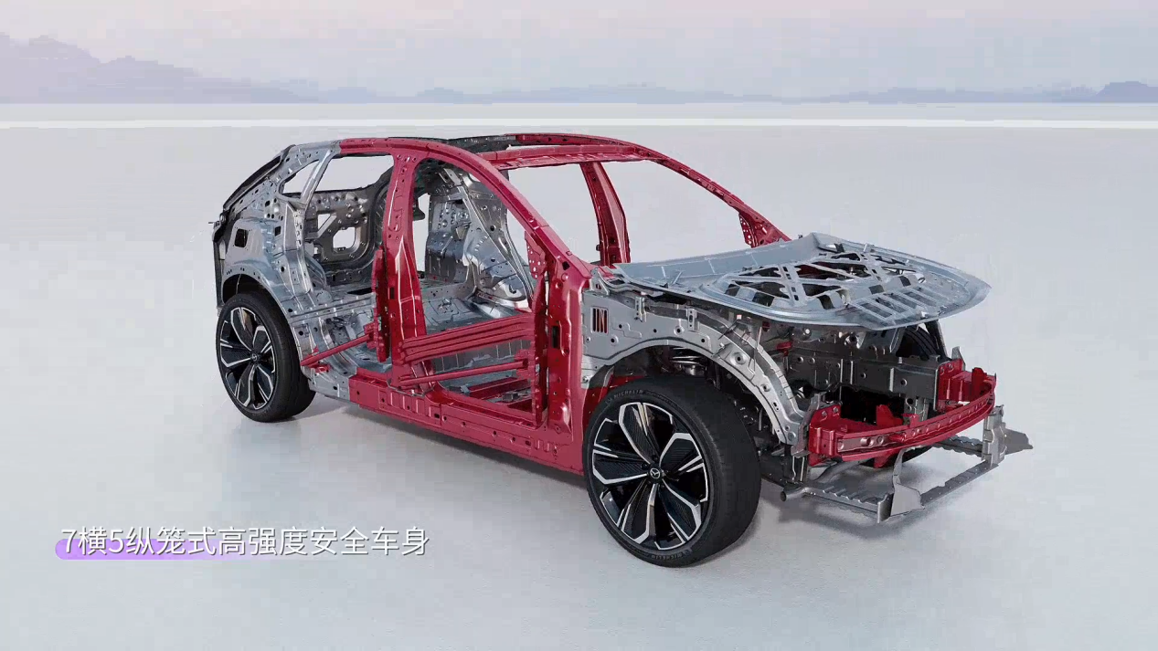 车身结构采用7横5纵笼式设计,高强钢占比达86.5%,热成型钢占比27.45%。全系标配9气囊,包括远端气囊,侧气帘长达2米,总容积370升,对前后排提供有效保护。电池安全方面,马自达EZ-60提前满足2026年新国标GB38031-2025,采用高安全磷酸铁锂正极,500℃高温不分解,低反应活性电解液分解温度提升至260℃。