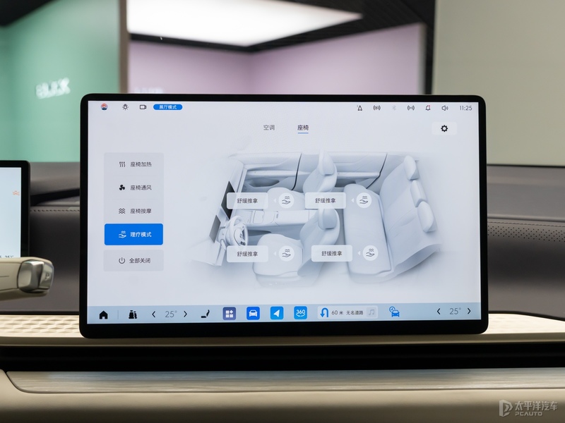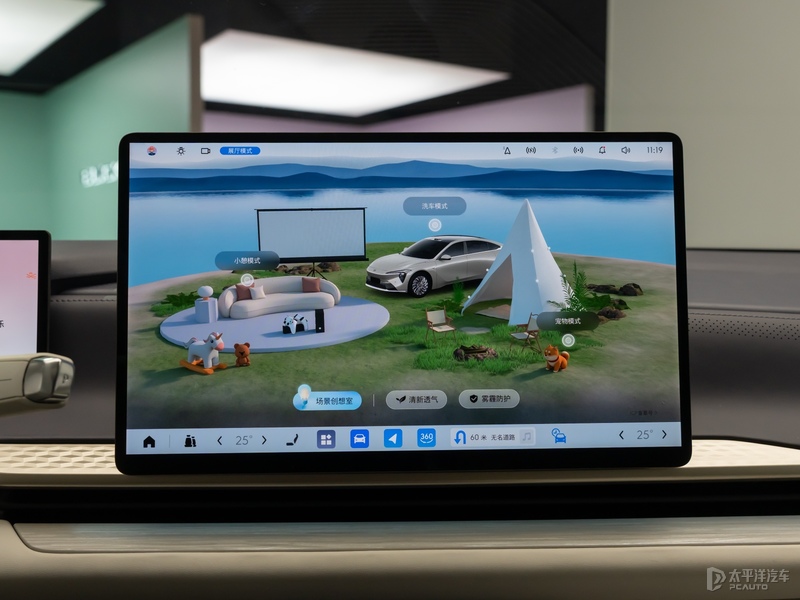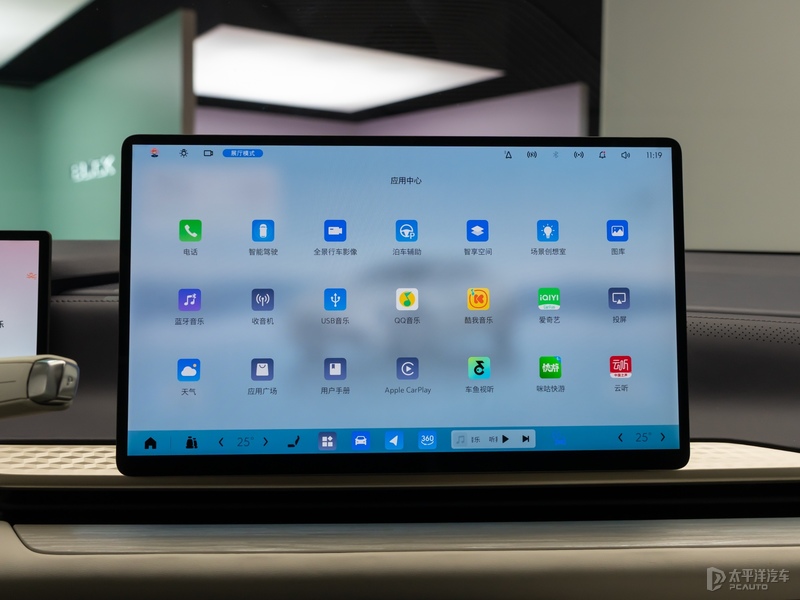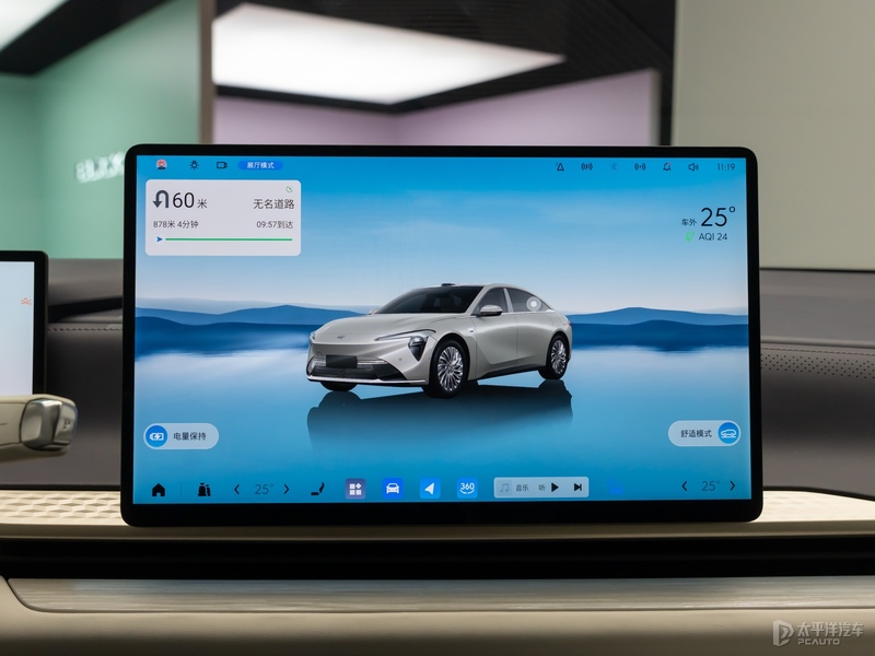 车机系统搭载全球首发的高通最新一代SA8775P芯片,NPU算力达72TOPS,保障车机系统响应流畅,在-40°C至125°C工况下稳定运行。车机功能还包括手机场景式备车功能,支持远程操控座椅、空调、香氛等组合设置,2秒内响应;低能耗哨兵模式,360°监测车周风险,分三档动态风险分级。