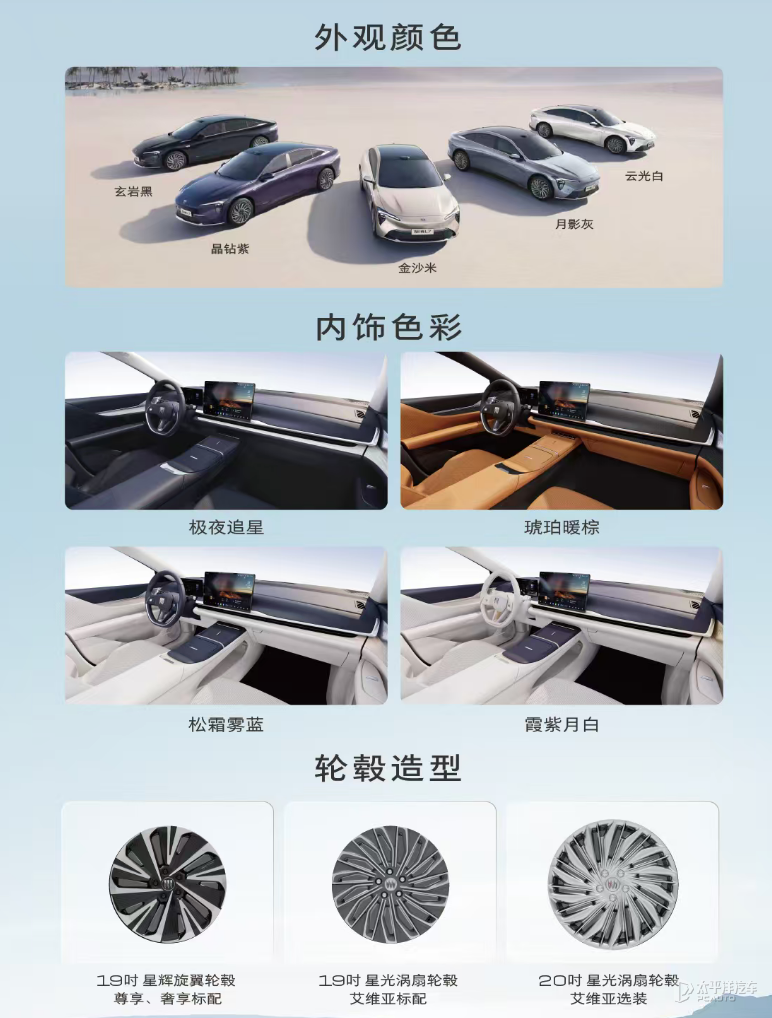 外观设计方面,别克至境L7设计灵感源于银河星空与流水浮岛,采用“水生美学”设计语言,将水的灵动融入车身形态。车身提供玄岩黑、月影灰、云光白、金沙米、星云紫、晶钻紫6种颜色可供选择。