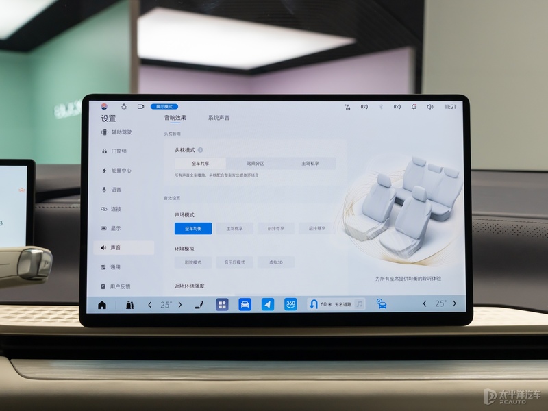 至境L7同级首发27扬声器音响系统,含多模式4座头枕音响,提供四大声场模式;还采用6mm前侧窗双层静音玻璃、5mm前挡风及天幕双层静音玻璃,达到图书馆级静音标准。车内提示与警示音融入“水生美学”,智驾提示音、车内提示音、车外警示音分别模拟落雨、海面、深潜音效。
