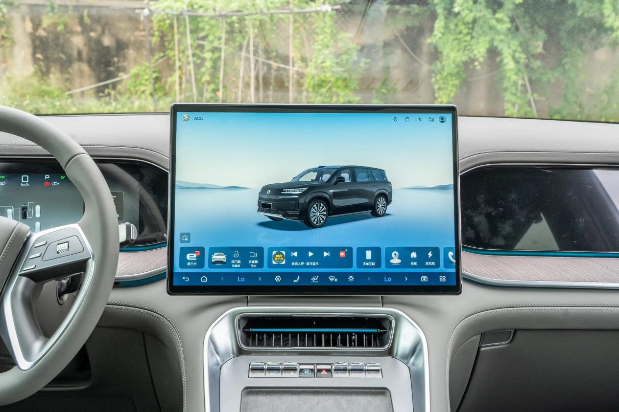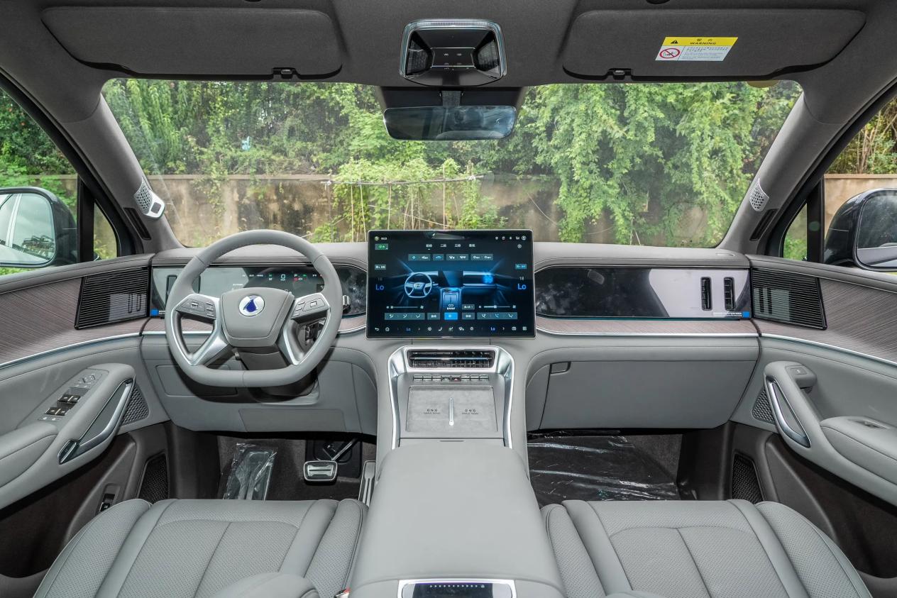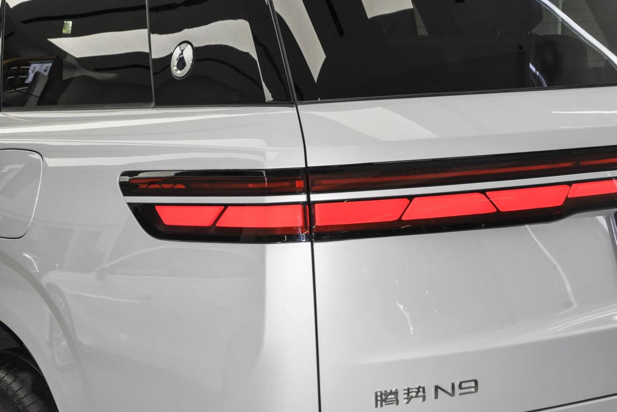 腾势N9的长宽高分别为5258×2030×1830毫米,轴距达3125毫米,属于大型SUV级别,座椅布局为六座设计,前两排均为独立座椅,全系采用NAPPA真皮材质包覆。前排主驾支持14向电动调节,配备CLA腿托与主动侧翼支撑,在转弯或急加速时自动充气提供侧向支撑。副驾为零重力座椅,支持一键放平与四向女王腿托。中排座椅除了常规的前后和靠背角度调节外,还支持横向移动,具备双50W无线充电、双小桌板、电动腿托与10点按摩功能。三排座椅支持六向电动调节,包括靠背、前后与坐垫抬升,可一键与二排联动形成双人床模式。
