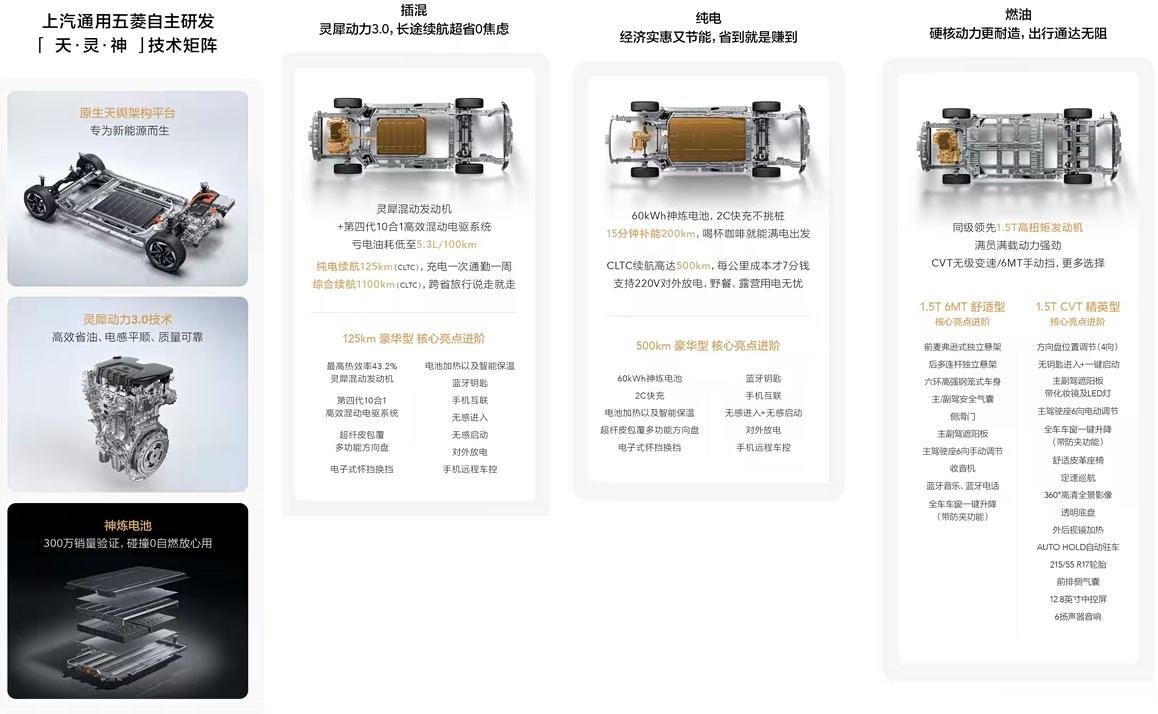 动力则是提供插混、纯电以及燃油三种动力可选,纯电版最大功率100kW,搭载60kWh神炼电池,续航500km(CLTC工况),支持2C充电,15分钟补能200km;燃油版搭载1.5T发动机,最大功率130kW,匹配6速手动和CVT变速箱。插混版本纯电续航125km(CLTC工况)、综合续航1100km(CLTC工况),想买的朋友可以关注下。