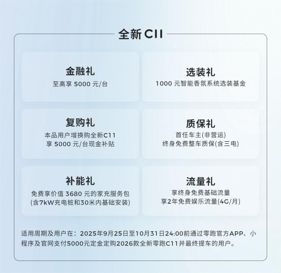 先直接上“硬菜”——为什么说现在是入手C11的好时机?零跑这次的购车政策,可以说是非常“实惠”了。终身免费的三电质保(电池、电驱、电控)和整车质保,直接解决了你对于新能源车后期维保的核心焦虑;免费送价值三千多块的家用充电桩和安装服务,又帮你省下一笔不小的开销;再加上金融贴息、选装基金和流量礼包,这一套组合拳下来,相当于把购车成本和未来几年的用车成本都给你打了下来。
