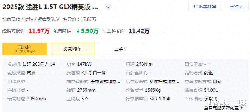 2025 款现代途胜L共有领先版、精英版、精英版 N Line、尊贵版、四驱尊贵版等多个车型版本 ,官方指导价在15.98 - 21.78万元之间。这样的价格看似很高,但在终端市场上,它有着59000元的优惠力度,优惠后的价格区间直接来到了10.08-15.68万元。这样的价格对于一台合资紧凑型SUV来说,确实已经来到了很低的位置。