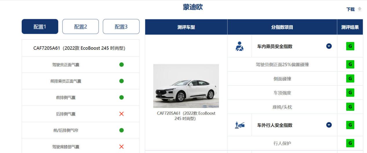 在中保研 C-IASI 测评中蒙迪欧获得了“全 G 评级”:车内乘员安全指数(含驾驶员侧正面 25% 偏置碰撞、侧面碰撞、车顶强度等)、车外行人安全指数、车辆辅助安全指数三大核心项目均获“G(优秀)”评级。