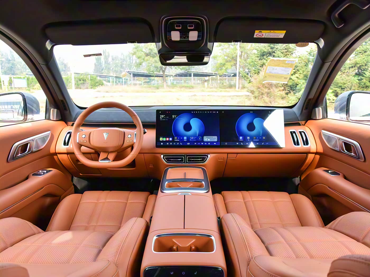 进入车内,内饰新增松木棕配色,搭配大面积软质材料包裹与木纹装饰板,营造温馨居家氛围。中控台采用 “T” 字形布局,15.6 英寸悬浮式中控屏搭载华为鸿蒙智能座舱,支持多屏交互与语音控制,响应速度流畅。核心亮点在于空间设计:六座布局采用 2+2+2 形式,第二排独立座椅配备扶手与电动调节,中间智能移动中岛支持 700mm 超长滑轨,可根据需求调整位置,兼具储物与置物功能。第三排彻底告别 “小板凳” 尴尬,360mm 座椅高度与 870mm 腿部空间,即便 1.8 米乘客也能舒展落座。后备厢常规状态下可容纳 7 个 20 寸行李箱,放倒第三排后容积扩展至 1392L。