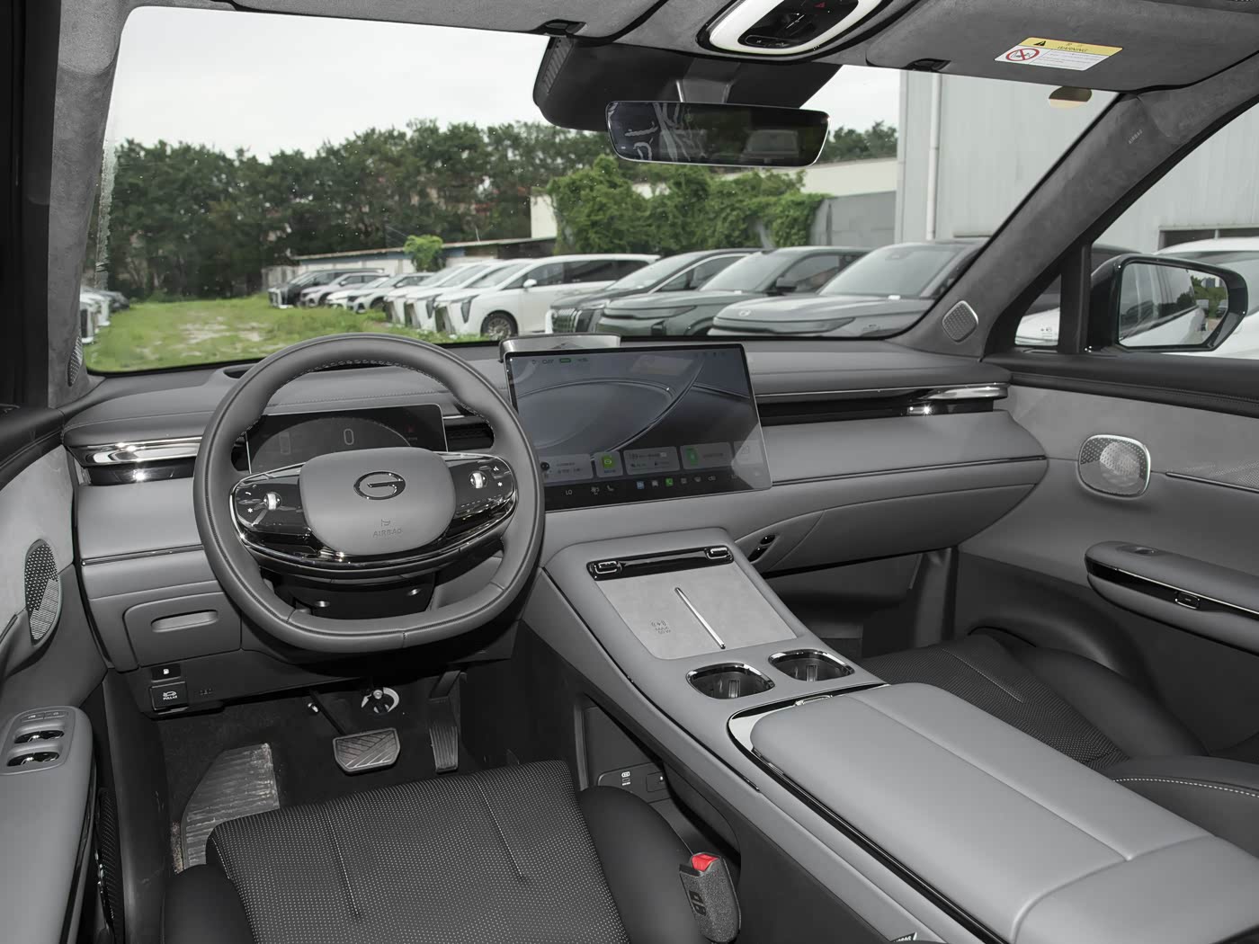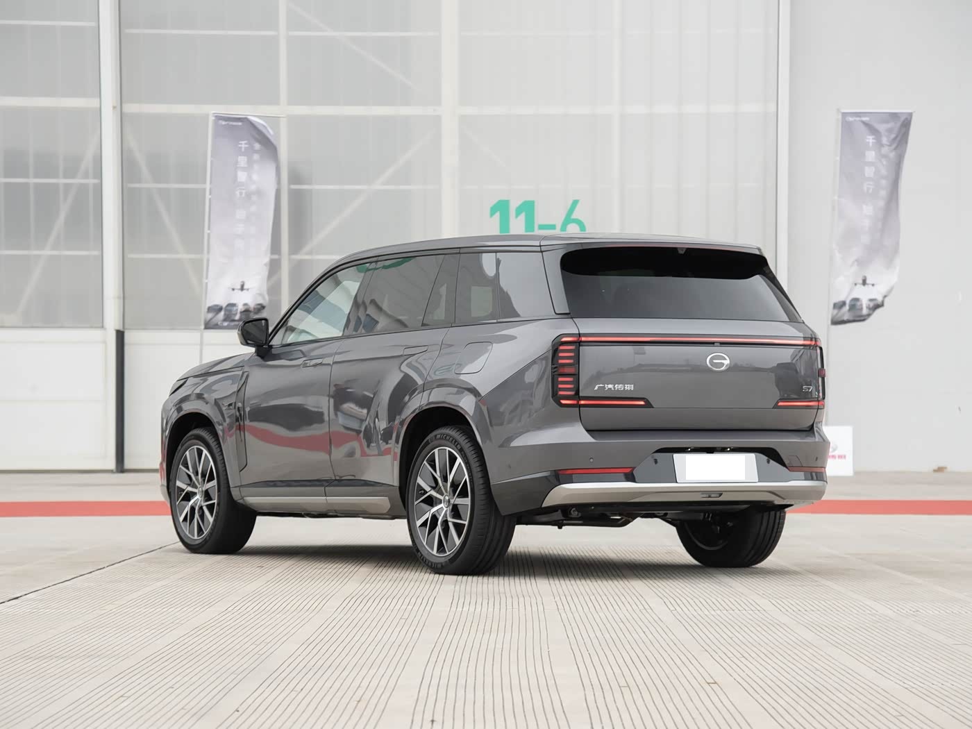 再来看车尾部分,尾延续车头的简约风格,贯穿式尾灯与前贯穿光带形成前后呼应,灯带细长精致,中间嵌入 “GAC” 标识,夜间点亮后辨识度极高。车顶小尺寸扰流板优化空气动力学表现,同时为车尾增添一丝运动气息。后包围采用与车头呼应的黑银撞色设计,下方银色护板与车身同高,能有效避免日常停车、倒车时的剐蹭。全系标配电动尾门,支持感应开启功能,双手抱着儿童座椅或购物袋时,轻踢保险杠下方即可开启,对家庭用户而言实用性拉满。整体设计没有追求夸张造型,而是以 “实用 + 精致” 的平衡,贴合家用车的核心需求。