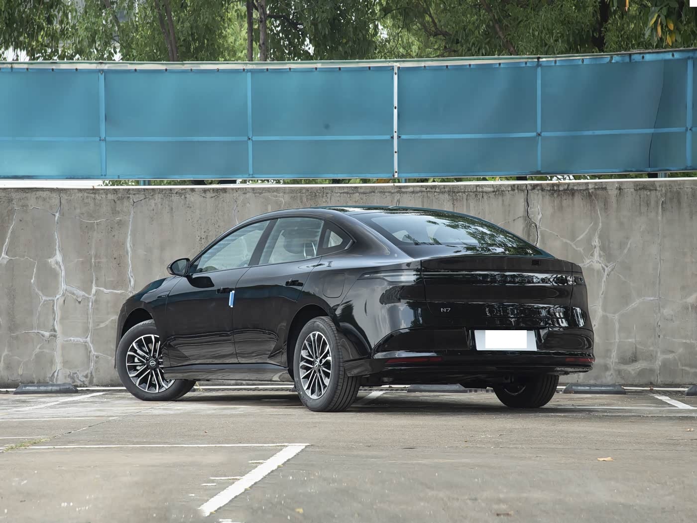 再来看车身侧面部分,车身侧面是 N7 的颜值高光区,4930mm 车长与 2915mm 轴距的黄金配比,搭配溜背造型,宛如优雅的移动雕塑。无三角窗的真无框车门堪称点睛之笔,配合隐藏式门把手与悬浮式车顶,让侧面线条一气呵成,将极简美学展现得淋漓尽致。这些设计不仅提升颜值,更将风阻系数降低,直接助力续航表现。而饱满的腰线更是让车身厚重感十足,同时,19 英寸轮毂提供多条辐低风阻和五辐花瓣两种样式,可选红色刹车卡钳强化运动氛围,但 225/45/R19 的特殊尺寸也带来后期更换成本较高的问题。