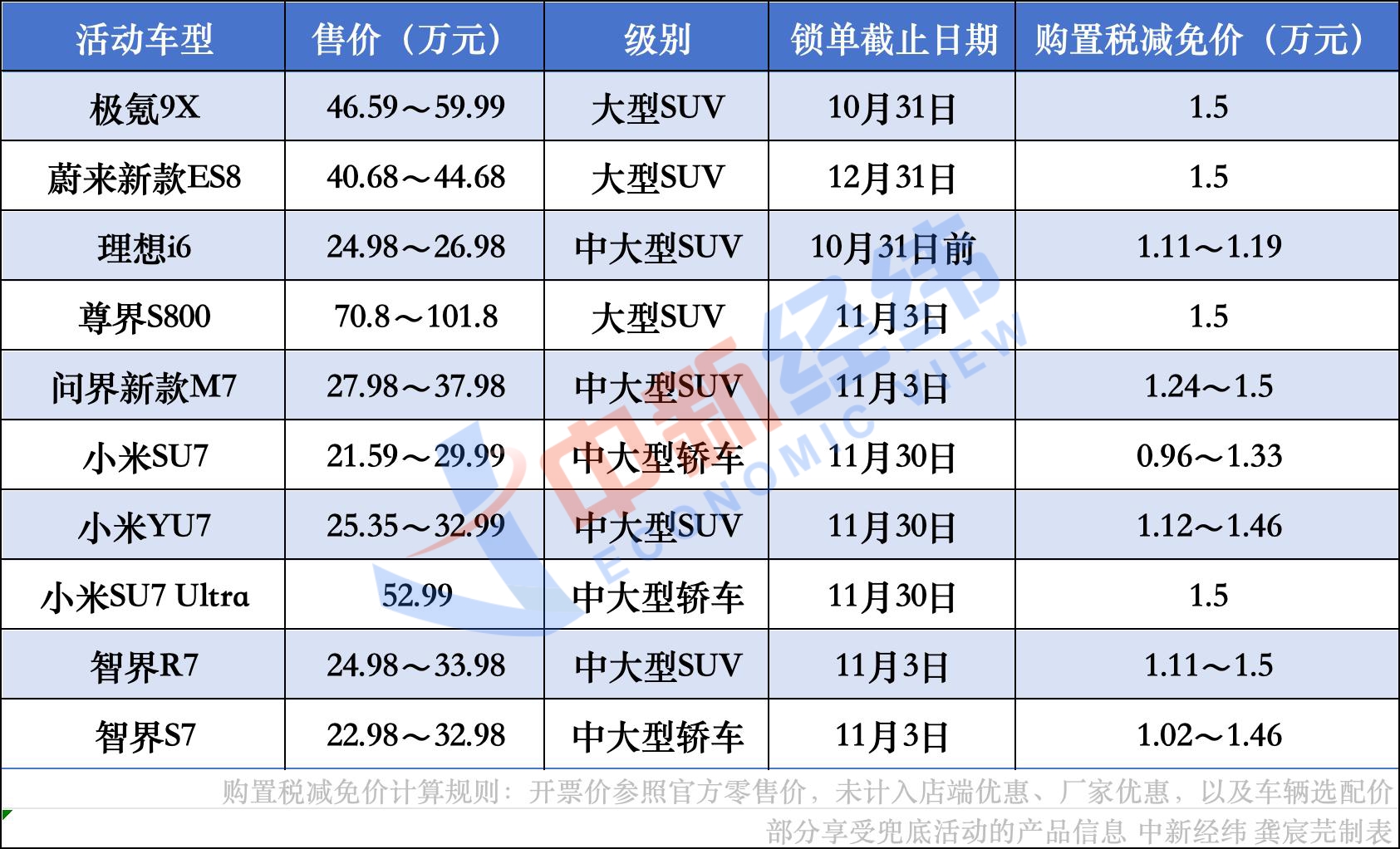随着新能源汽车购置税减半征收政策的临近,不少车企都在近期发布了购置税兜底活动,即对部分交车时间在2026年以后的热销新车,采取限时补贴至高1.5万元购置税的举措,大部分活动都在11月结束。