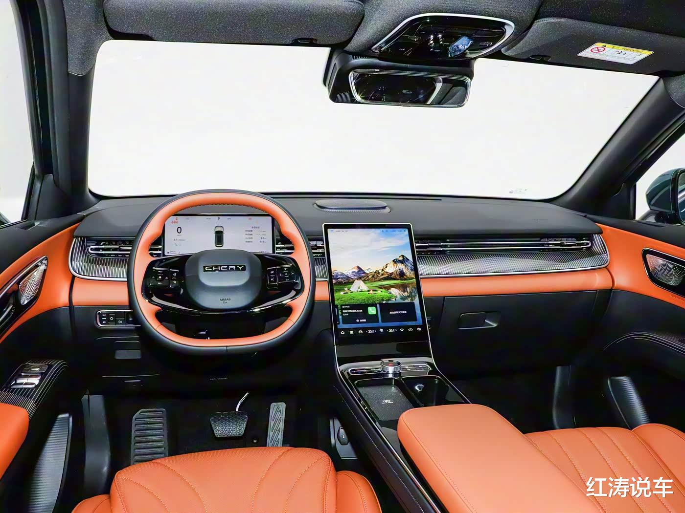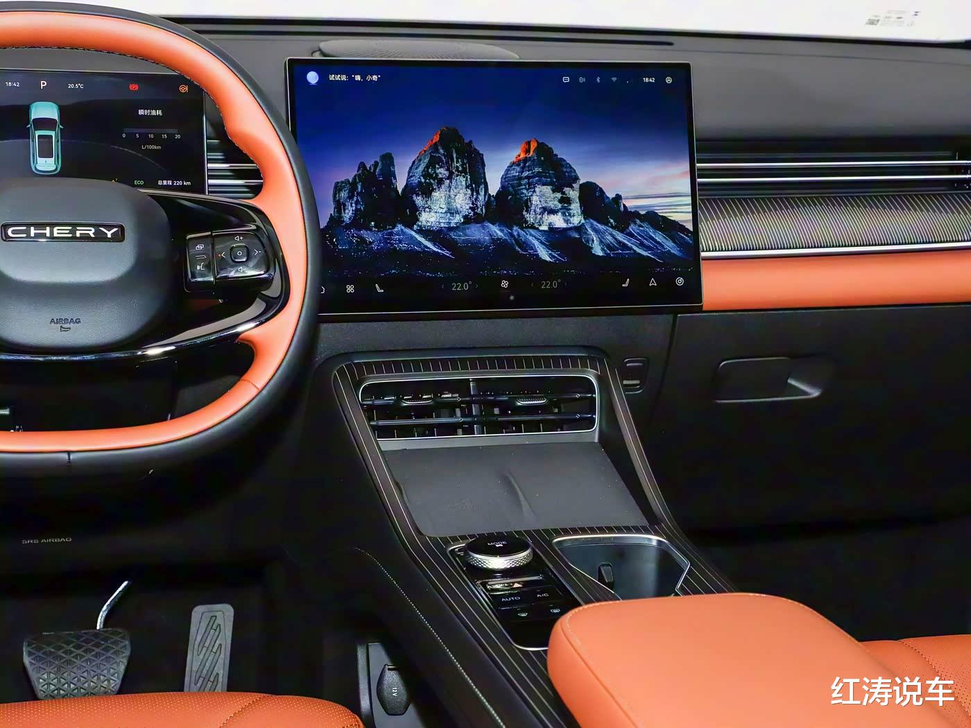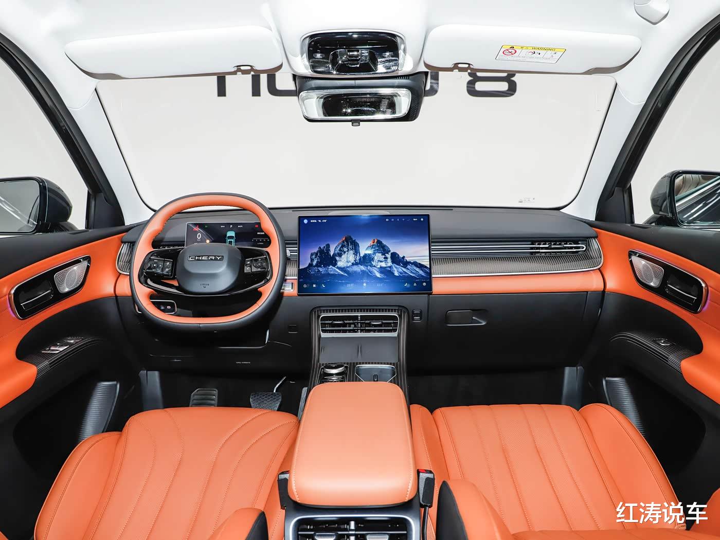 全新瑞虎8提供墨竹黑和琥珀棕两种内饰配色,中控台使用带有纹理的饰板来提升质感,不同之处是:虎款车型提供15.6英寸悬浮式横置中控屏,设计有双手机放置平台和单无线充电板,豹款车型则使用13.2英寸一体式纵置中控屏,保留部分空调控制实体按键和单手机无线充电板,均搭载雄狮车机系统,内置高通骁龙8155芯片。