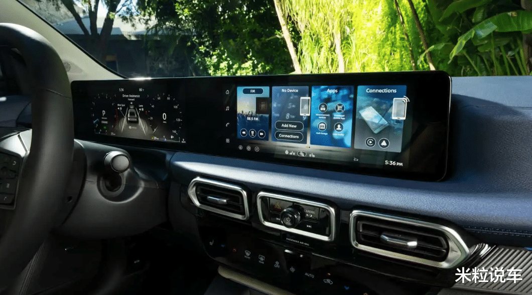 内饰设计同样进行了更新迭代,已经采用上了贯穿样式的大联屏设计,但是从发布的实车图片来看,边框依然是偏厚重一些的。而且整个页面显示的智能化应用并不多,目前显示的仅仅只有收音机,导航以及手机互联系统。至于应用商店,预计匹配的APP不会特别多。