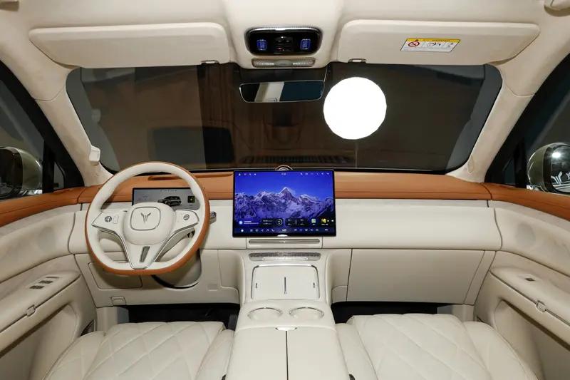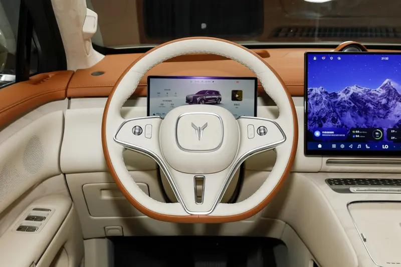 座舱设计上,岚图泰山从中国山水意境与传统建筑中汲取灵感,以“山水入境”为核心,强调舒适内饰与用户情感共鸣,采用温润雅致的材质与色调,营造出如置身自然画卷的静谧氛围,首批推送最新版鸿蒙座舱语音大模型。方向盘的设计也颇有质感,上面有镀铬装饰和金属质感的滚轮按键。