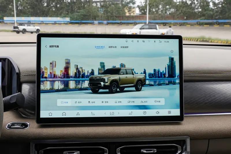 内饰方面,锋坦FrontierPro采用了非常前卫的乘用车化设计,搭载14.6英寸悬浮中控屏与全液晶仪表,配有实体的钢琴按键以及电子排挡杆。