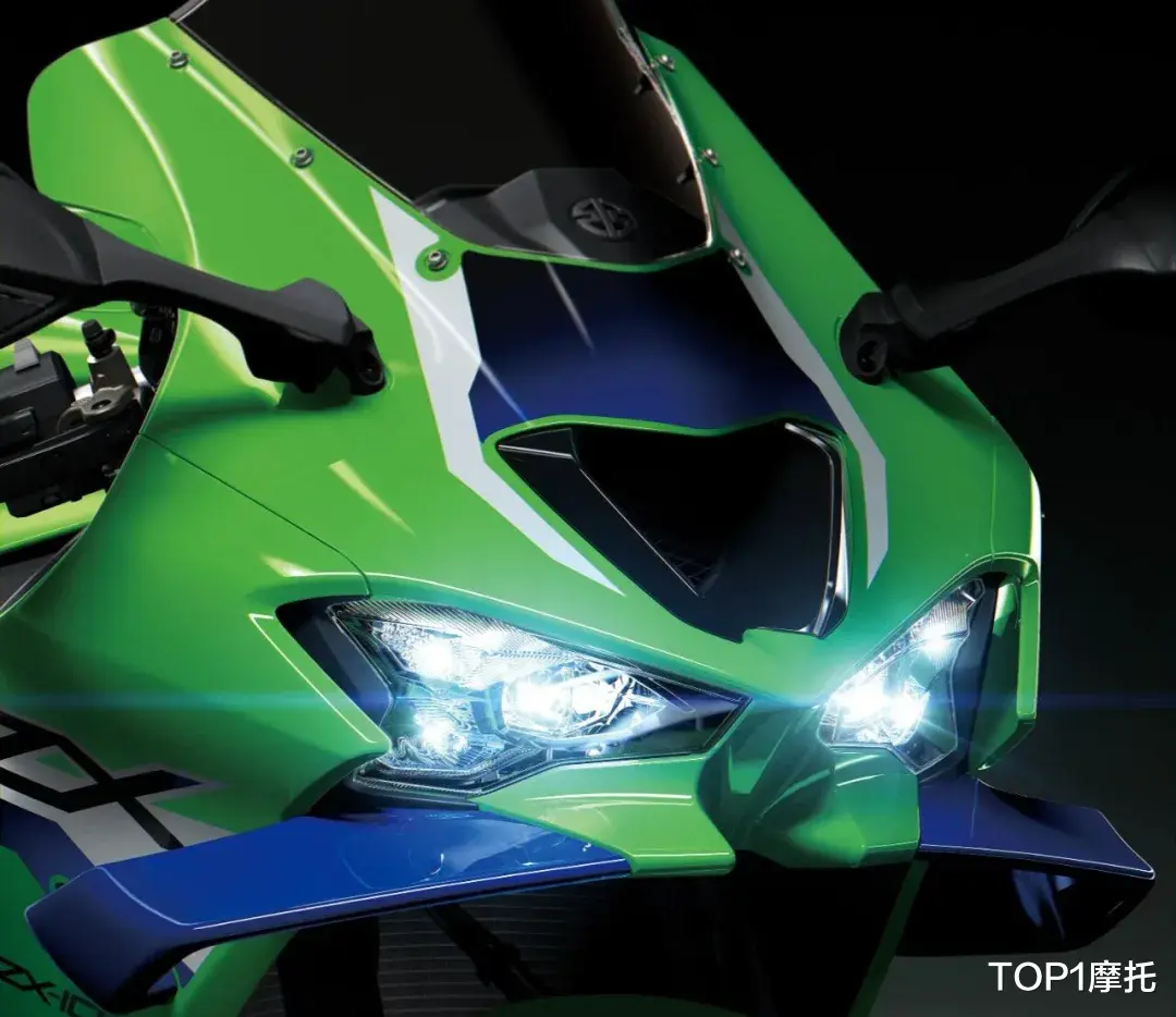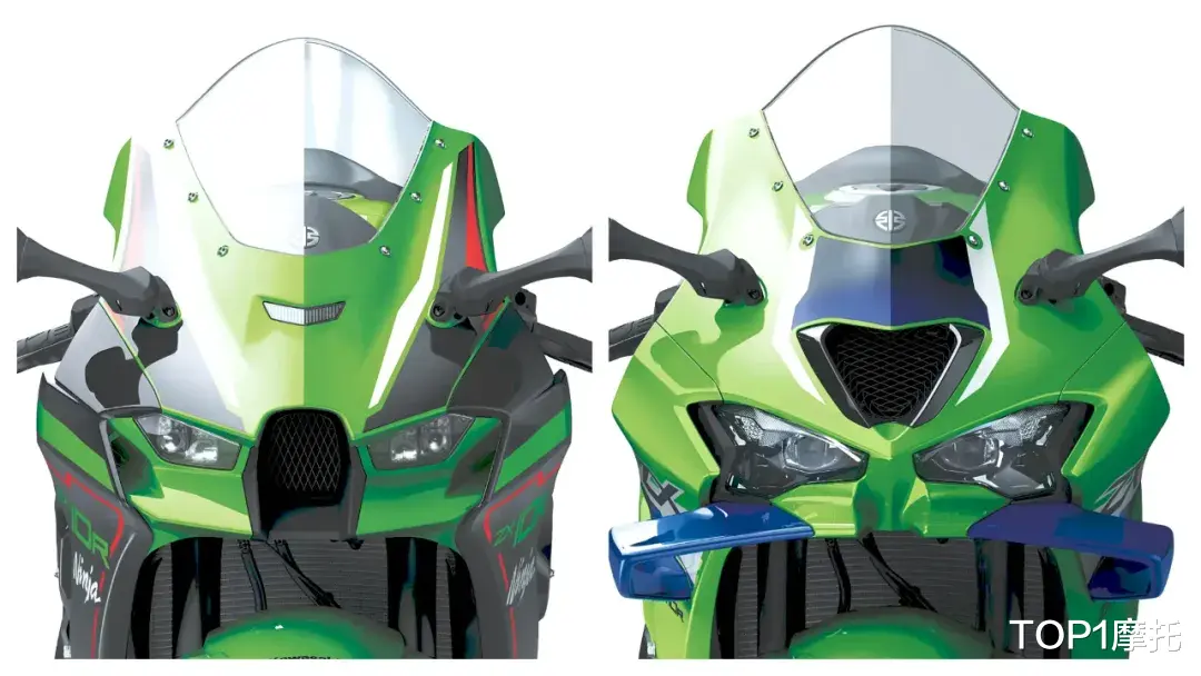 从车头看Ninja依然是Ninja,但2026款ZX-10R配备了最新的家族化头灯,与新款的ZX-6R相似,对比老款更加紧凑的前大灯区别明显。而且重新设计的Ram Air车头冲压进气口,造型也接近新的ZX-6R,甚至面积更大了,此外风挡也经过重新设计,以更好的降低了空气阻力。