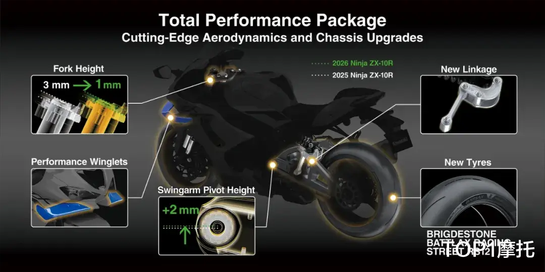 不过,新款车型的底盘几何结构经过优化,以配合增加的下压力。后摇臂枢轴点升高2mm,提升了后轮牵引力和弯道抓地力;同时改进的后悬架连杆机构和更轻的弹簧刚度增强了加速时的稳定性和舒适性。前减震和后减震器现在经过重新设置,以改善重量心和操控灵活性。专注于赛道的ZX-10RR版本,进行了进一步的改进包括在前叉内管上涂上钛涂层以减少摩擦,以及针对其单座布局量身定制的特定阻尼和弹簧设置。新款ZX-10R标配普利司通Battlax RS12轮胎,取代了之前型号的RS11轮胎。ZX-10RR则配备倍耐力Diablo Supercorsa SP V3轮胎。