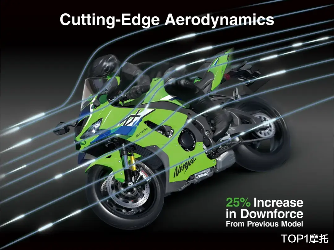 新的ZX-10R还首次配备了定风翼,定风翼的造型向下延伸,造型不算特别夸张,不过川崎称与上一代ZX-10R车型相比,新款车型的下压力提升了25%,从而提高了高速行驶时的稳定性以及入弯时的精准度,同时改善前轮操控感和弯道稳定性。而这也是川崎Ninja系列当中,唯一采用定风翼的车型,这是不是也意味着之后Ninja系列都将陆续加入定风翼呢。