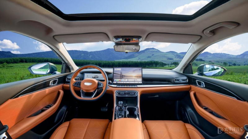 进入车内,第5代帝豪给人的视觉效果十分豪华,内饰用了不少钢琴烤漆面料装饰。新车有3种内饰颜色可以选,分别是旷野棕、云舒灰和星夜黑。