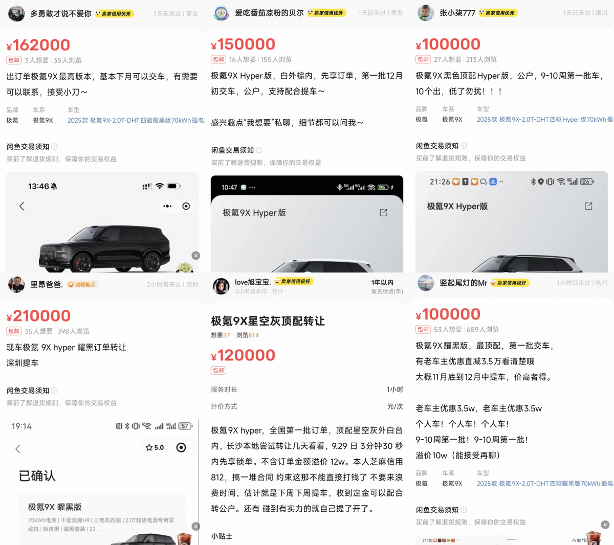 “极氪9X现在已经变成硬通货了,订单加价8.8万元出手还算少的,出口的订单据说能加到20多万元。”一位汽车博主在社交媒体上这样写道。在闲鱼等二手交易平台上,极氪9X订单转让市场近期的活跃度确实令人惊叹:Hyper版车型的订单加价幅度高达8-21万元,即使是普通版也普遍存在2万至5万元的加价。