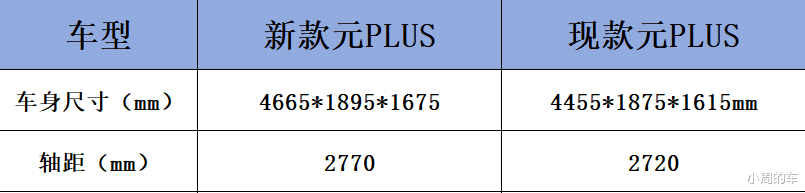 新车的长宽高分别为4665*1895*1675mm,轴距达到了2770mm,作为对比,现款元PLUS的尺寸是4455*1875*1615mm,轴距是2720mm。对比下来可以看出,新车的车长增加了210mm,轴距增加了50mm,这将会为它带来更为充裕的后排乘坐空间,同时后备厢的装载能力也有望得到进一步的提升。