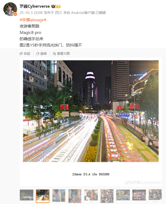 IT之家10月4日消息,荣耀首席影像工程师罗巍昨晚在微博分享了Magic8Pro手机的拍摄样张,其中包括“15秒手持流光快门”的样张,并询问网友“防抖强不”。