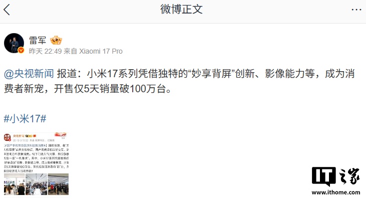 IT之家10月6日消息,央视新闻昨日报道,小米17系列手机开售仅5天销量破100万台,雷军本人进行了转发确认。