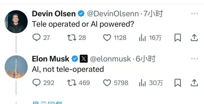 对此马斯克在评论区直接给出明确答复:“用的是AI,并非遥控操作。”