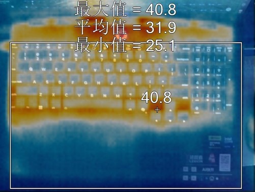 开启静谧高性能模式之后,温度改善还是相当明显的,键盘与腕托区域最高温度下降到了40.8℃,低于AI高静游戏本42℃的壳温标准。