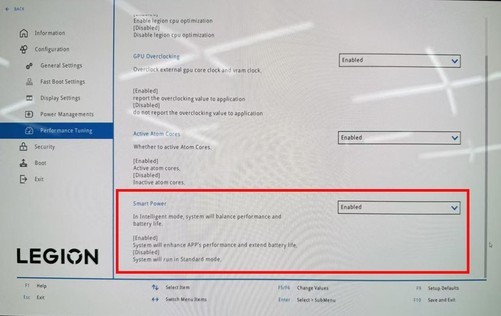 联想拯救者Y9000P在BIOS里的性能调整选项里增加了SmartPower选项,开启之后即可打开新增的静谧高性能模式。在这一模式下,AI高静游戏本限定了壳温范围,即小于等于42℃。