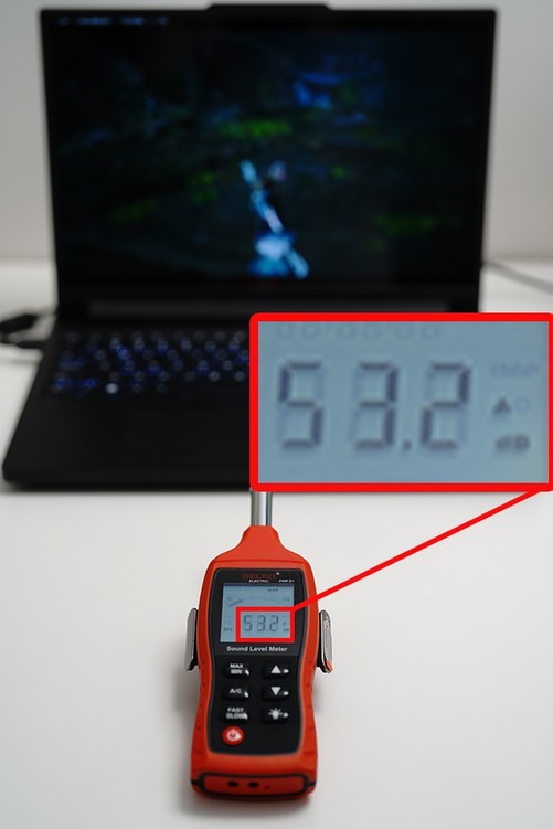 最终我们出具了两份噪音检测报告,首先在超能模式下,噪音平均分贝为49;而当切换到静谧高性能模式后,同样测试环境下,噪音平均分贝可以控制在43,降低了6分贝,实际听感上也是更加舒服一些,长时间游戏本也不会感觉那么吵。