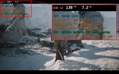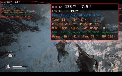 另外通过游戏内的功耗监测可以看到,下面第一张图为超能模式,可以看到CPU功耗为42W左右,GPU功耗为104W左右;而下面第二张图是切换到静谧高性能模式后的功耗截图,可以看到CPU功耗下降到了27W左右,GPU功耗基本没有变。CPU功耗下降之后,酷睿Ultra9275HX配合RTX5060笔记本电脑GPU是足以继续支撑游戏在高频率下运行的,同时酷睿Ultra9275HX优异的能效使其温度更低,风扇转速会随之下降,从而达到了“高性能静音”的表现。