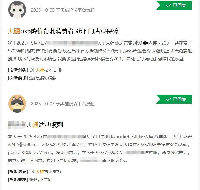 有用户晒出聊天记录显示,自己购买的Pocket3激活后仍成功申请退货退款;也有用户表示,有经销商以"已激活"为由拒绝退差,只能通过投诉维权。