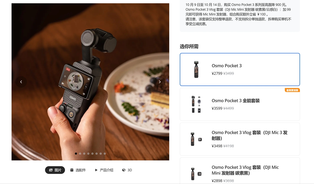 具体来看,大疆本次从10月9日开始,持续到10月14日的降价幅度非常大,其中Pocket3标准版直降700元(3499→2799元),Action4最高降1129元,Mini4PRO降价1478元。8月刚发布的扫地机器人和7月上市的全景相机也在其中,部分机型降价时间距离首发不足三个月。