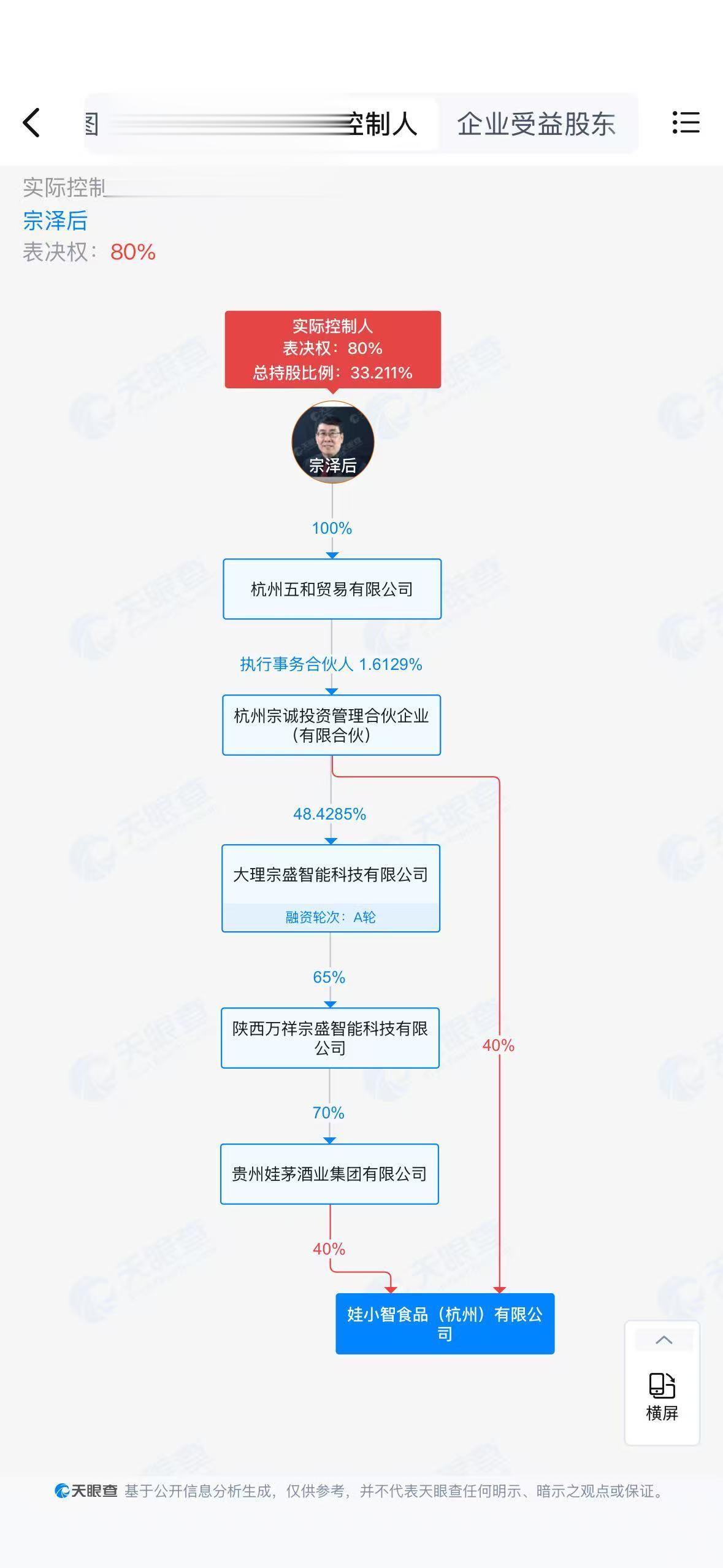 天眼查APP显示,娃小智食品(杭州)有限公司,成立于2025年,位于浙江省杭州市,是一家以从事批发业为主的企业。股权穿透后,宗泽后为该公司实际控制人。