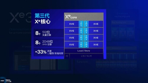 在Xe3核心中,提供了8个512位矢量引擎和8个2048位XMX引擎,并且将L1缓存增加了三分之一,赋予了Xe核心更强大的性能。