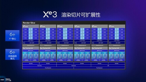 这次PantherLake的iGPU优化主要是扩展性层面的提升,这使其核心实现了更大的规模。单个渲染切片最多包含的Xe核心达到了6个,顶配型号拥有12个Xe核心,这种核心规模的升级对于GPU而言就是最直接的性能提升手段。