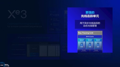 在光追单元方面,这一代开始支持异步光线追踪的动态光线管理。其实在光线追踪中最具挑战性的是管理大量光线,当光线过多导致硬件单元无法及时处理时就会发生拥塞。此时,GPU就需要一个更优的调度机制,能在拥塞即将到来时降低光线分发频率,这自然需要高效的调度器设计。Xe3支持下一代异步光线追踪的动态光线管理,可大幅提升光线追踪负载下的性能。
