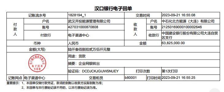 转账记录显示,2023年9月21日,开投能源通过企业网银向中石化北方能源(大连)有限公司对公账户足额支付6382.5万元。