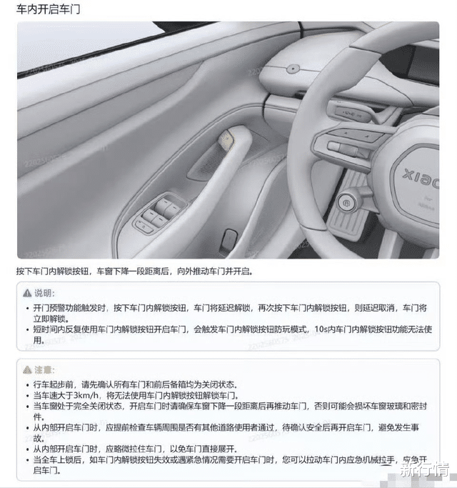查询小米汽车官网的SU7用户手册了解到,在介绍“车内开启车门”的部分,手册提示:“当全车上锁后,如车门内解锁按钮失效或遇紧急情况需要开启车门时,您可以拉动车门内应急机械拉手,应急开启车门。”