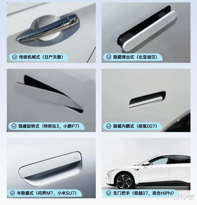 当前,隐藏式门把手已成为新能源汽车的主流设计,形态也愈发多样,包括跷跷板式、整体伸出式、按钮式、内扣式、全隐藏式及半隐藏式等。