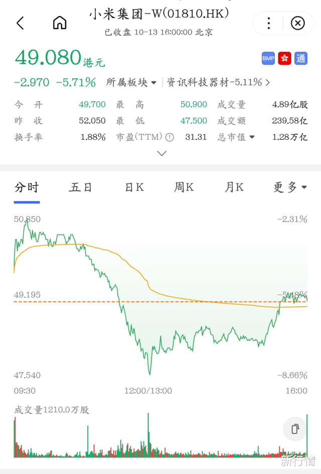 或受此消息影响,小米集团港股股价一度暴跌8%,截至收盘,小米股价跌5.71%,小米集团总市值较前一日蒸发超千亿港元。