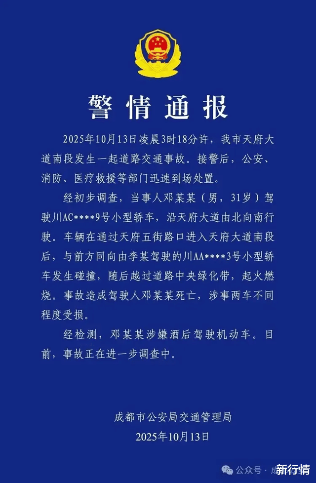 而后,成都警方发布警情通报:事故造成驾驶人邓某某死亡,经检测,邓某某涉嫌酒后驾驶。